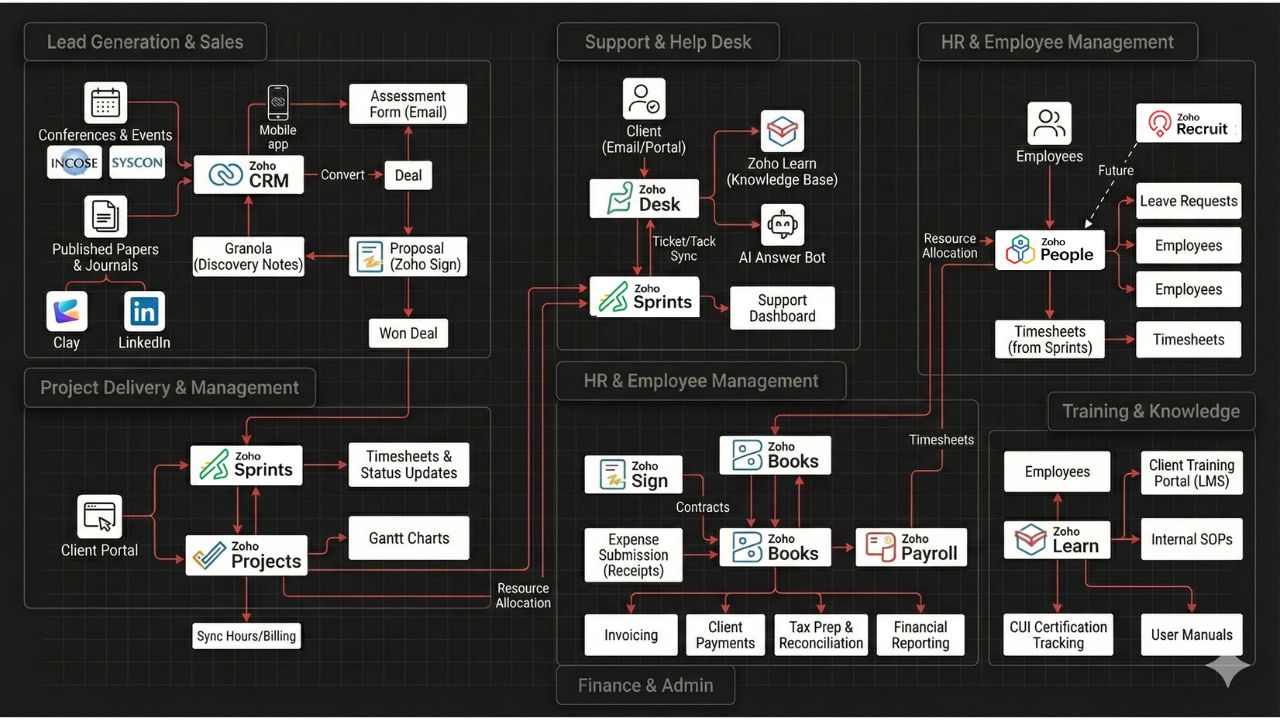 - Zoho Customization: We helped the client configure Zoho products to match their unique workflows and processes, ensuring that all tools worked seamlessly together.